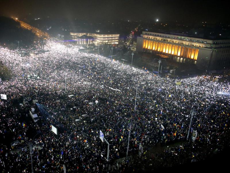 Allein in der Hauptstadt Bukarest gingen etwa 250 000 Menschen auf die Straße. Mit Taschenlampen und leuchtenden Mobiltelefonen bildeten sie ein eindrucksvolles Lichtermeer. Die Metrostation am Platz des Regierungssitzes wurde geschlossen, um Gedränge in den Unterführungen zu vermeiden. Viele junge Leute waren aus der Provinz zum Protest nach Bukarest gereist. Sie nutzten dabei einen neuen Regierungsbeschluss, demzufolge Studenten kostenlos Eisenbahn fahren dürfen. In mindestens 20 weiteren Städten gab es Kundgebungen mit jeweils Tausenden oder sogar Zehntausenden Demonstranten.