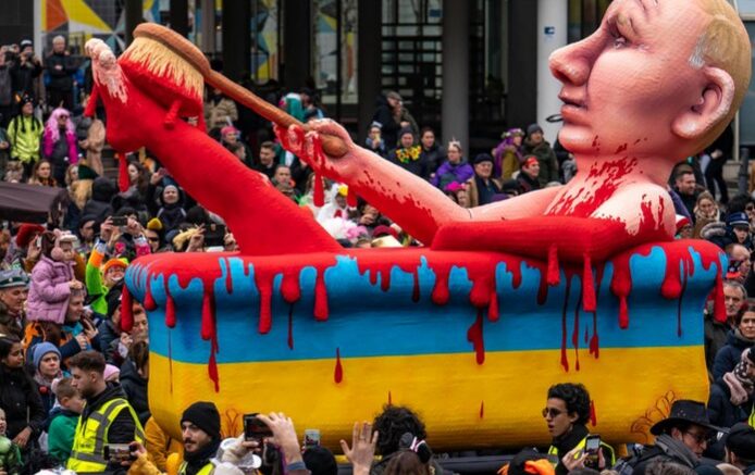 In einem Mottowagen aus Februar 2023 wurde der russische Präsident Wladimir Putin satirisch hochgenommen. Da sitzt ein gut erkennbarer Putin in einer Badewanne voller Blut, die gelb-blau angestrichen ist: eine Anspielung auf den russischen Angriffskrieg gegen die Ukraine und die üble Rolle, die Putin dabei spielt.