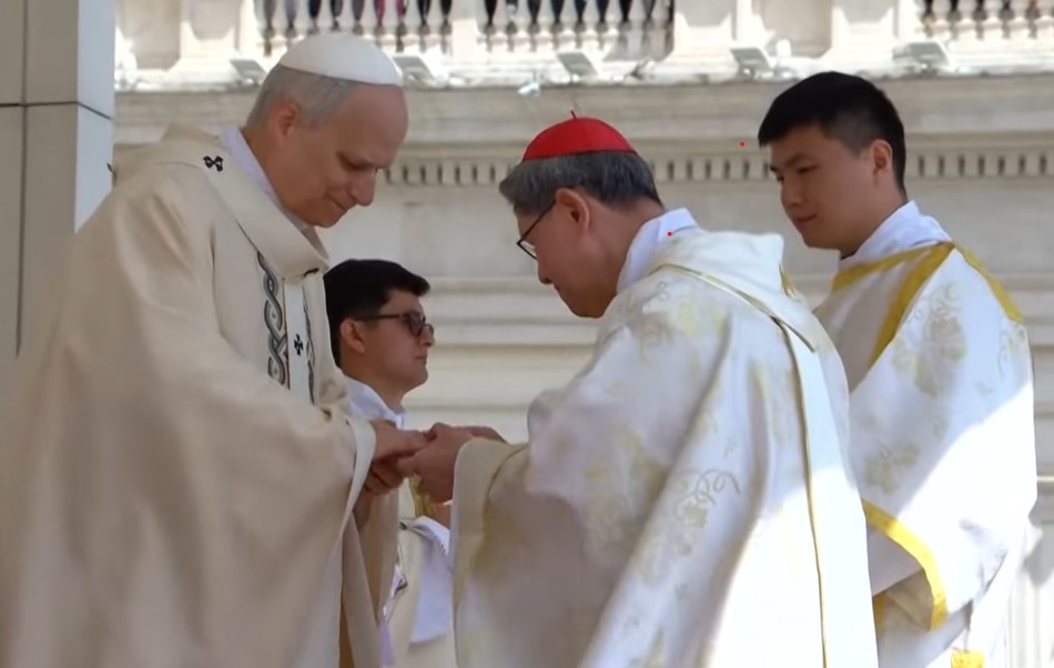 Dann streifte Kardinal Luis Antonio Tagle traditionell den goldenen Fischerring an die rechte Hand Papst Los. Der Fischerring mit Petrus darauf unterstreicht als Insignie seiner Macht die Rolle des Papstes als „Menschenfischer“, der gesandt ist, Menschen für den christlichen Glauben zu begeistern.