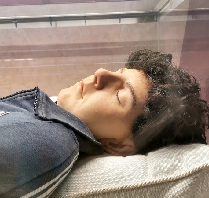 Dort liegt er präpariert in einem verglasten Sarkophag in Nike-Turnschuhen, Jeans und Sweatshirt. Die Gläubigen stehen Schlange, um einen Blick auf den toten Teenager zu werfen.