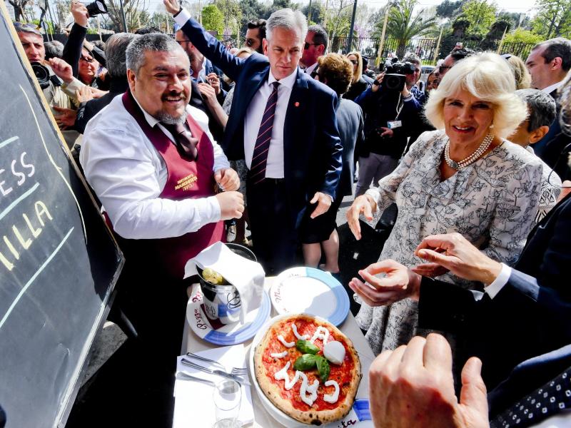 Während der britische Thronfolger am Samstag unter anderem auf einem britischen Soldatenfriedhof bei Vicenza war, tourte seine Frau durch Neapel. Dort bekam sie nicht nur eine Pizza mit ihrem Namen darauf geschenkt, sondern besuchte neben einem Krawattenhersteller auch die Ausgrabungsstätten von Herculaneum bei Pompeji.