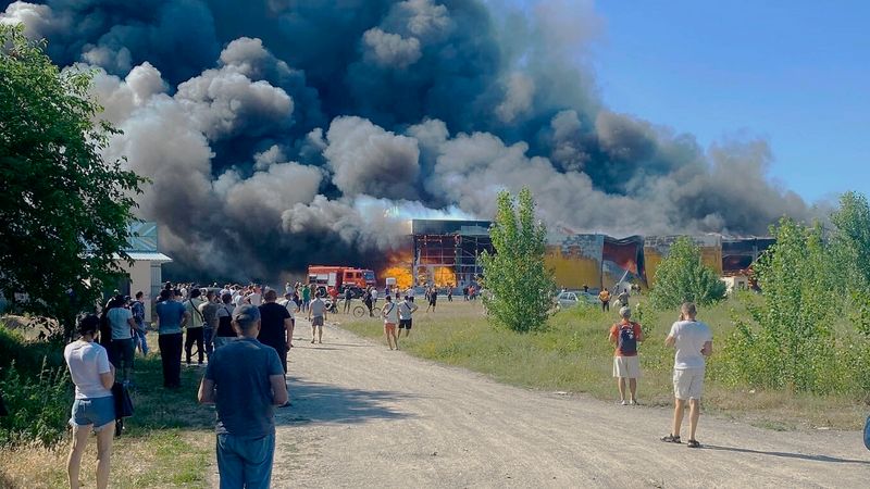 Brand zerstört Einkaufszentrum nach Raketeneinschlag