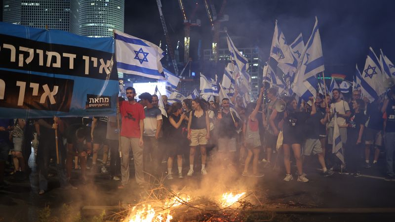 Auf der Kundgebung in Tel Aviv, an der nach Schätzung des Senders Kan zwischen 20.000 und 30.000 Menschen teilnahmen, zündeten Demonstranten Feuer auf mehreren blockierten Straßen an. Die Polizei hatte sichtlich Mühe, wieder Ordnung herzustellen. Mehrere Menschen wurden festgenommen.