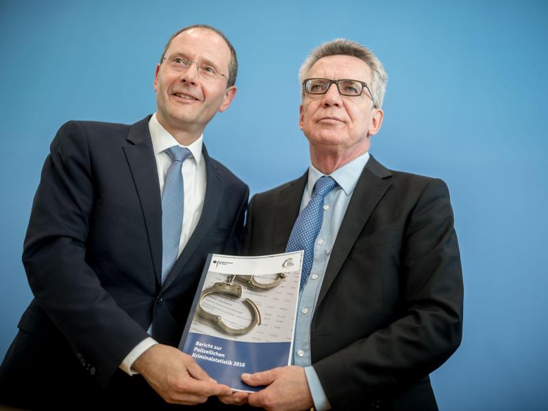Innenminister De Maiziere präsentiert mit dem Vorsitzenden der Innenministerkonferenz, Sachsens Innenminister Ulbig, den Bericht zur Polizeilichen Kriminalstatistik 2016. Foto: Michael Kappeler